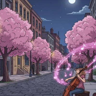 Across the street and beneath the cherry blossoms, a man stood, captivated by the magic of the music.